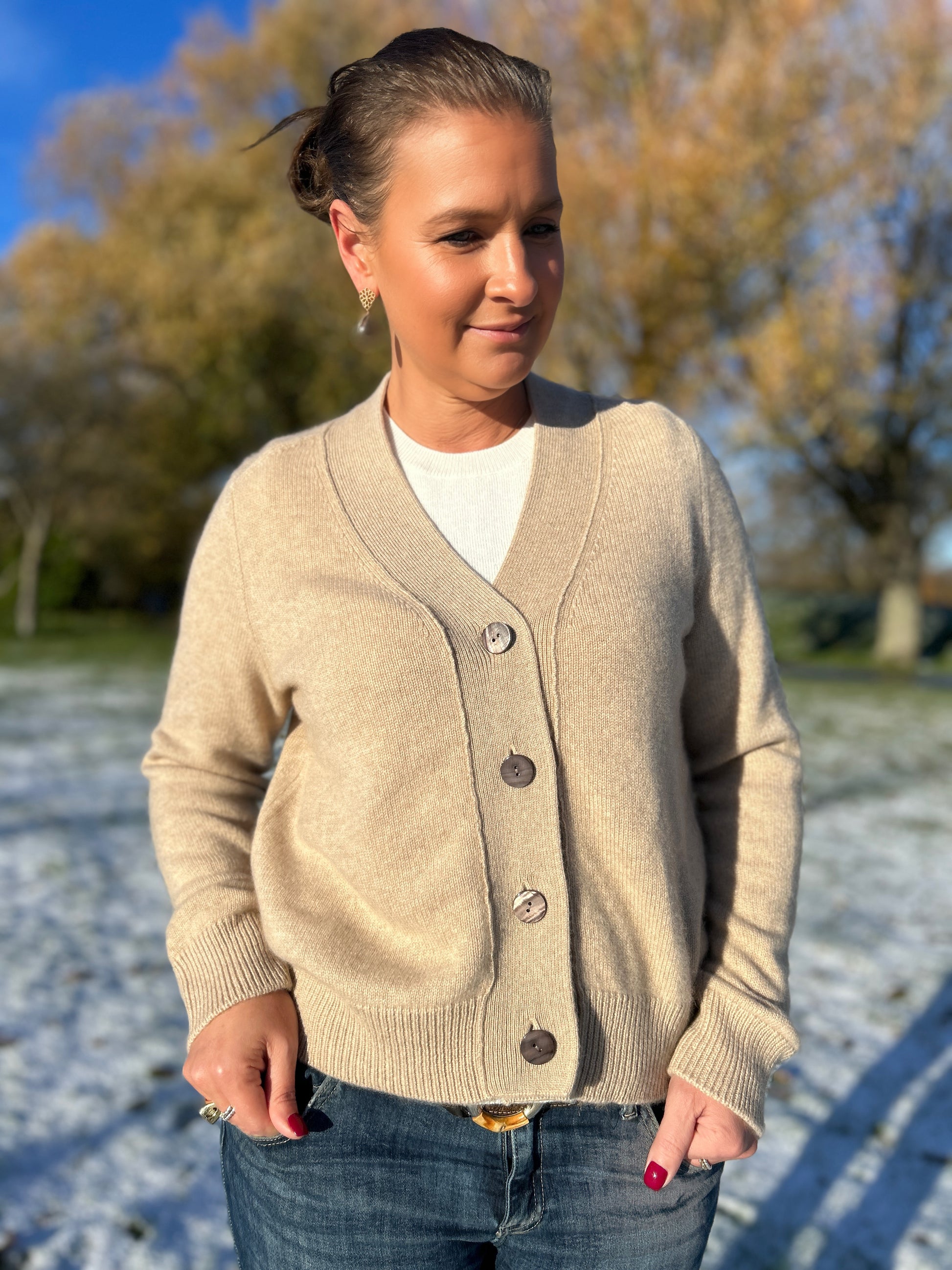Vår kashmirkofta i beige är det ultimata valet för dig som söker mångsidig stil och maximal komfort. Tillverkad i 100% cashmere, erbjuder den en fantastisk kombination av värme och elegans. Den tidlösa beige nyansen gör koftan enkel att matcha med allt från jeans till klänningar, vilket gör den till ett självklart inslag i din garderob.