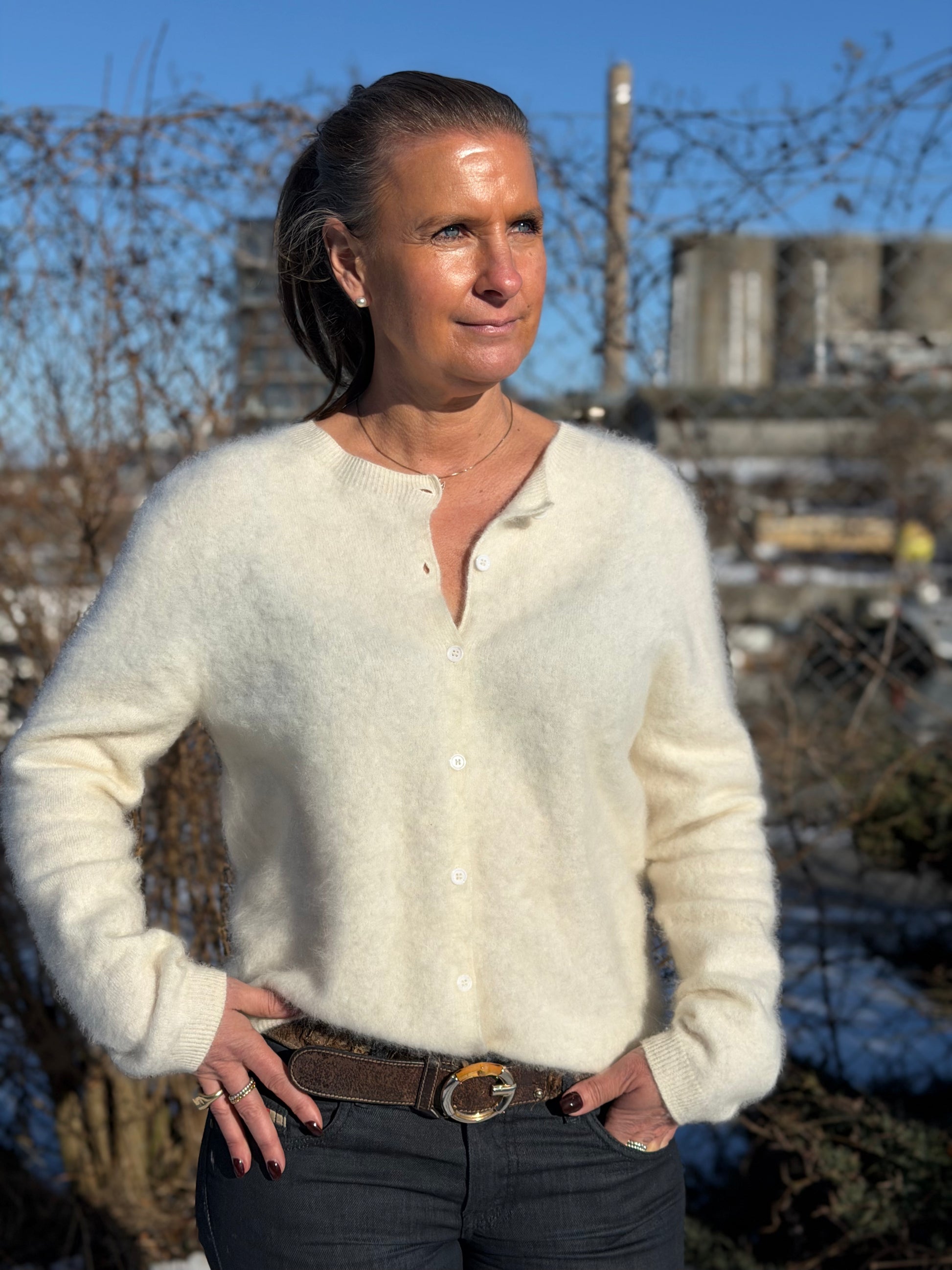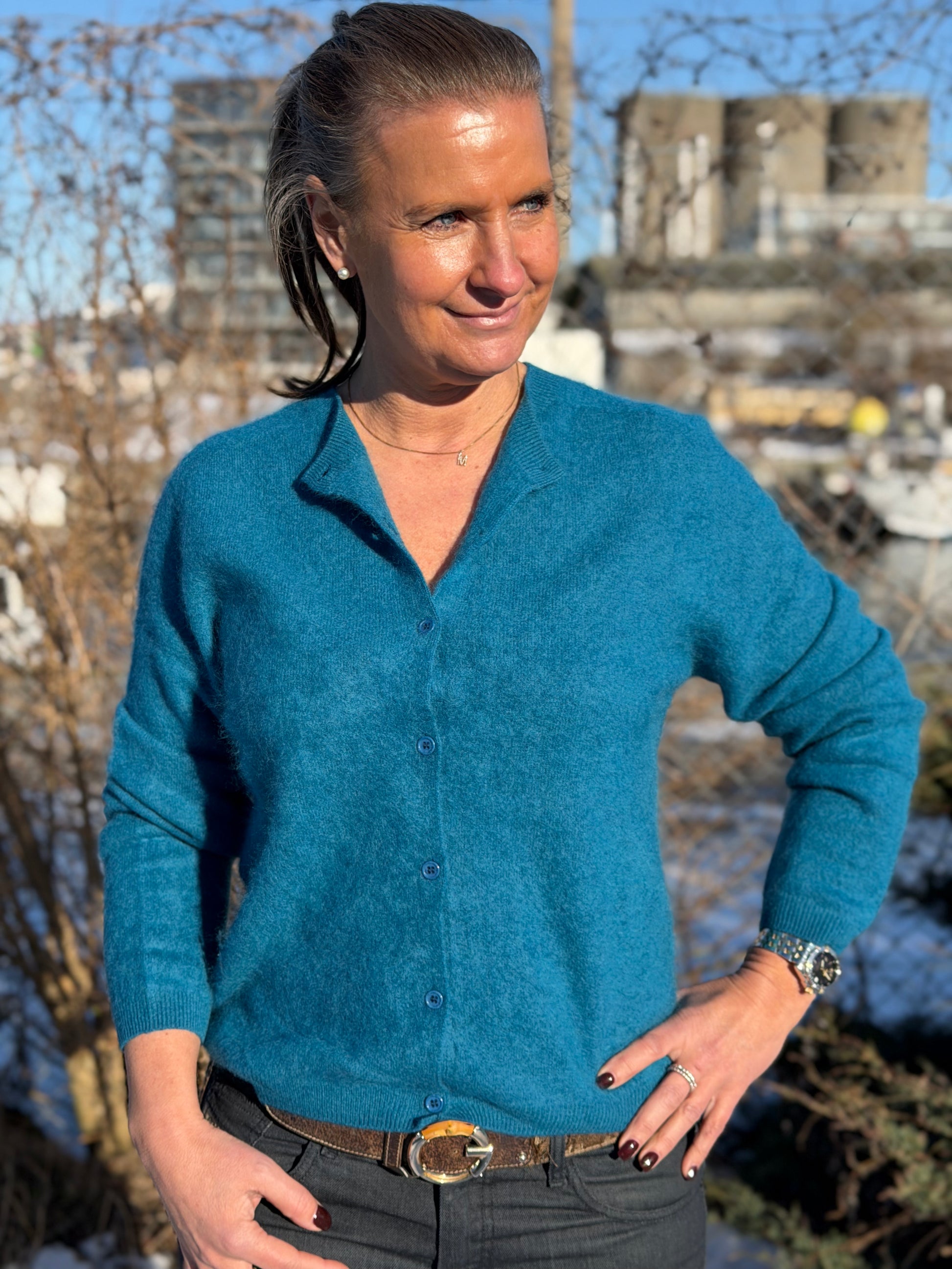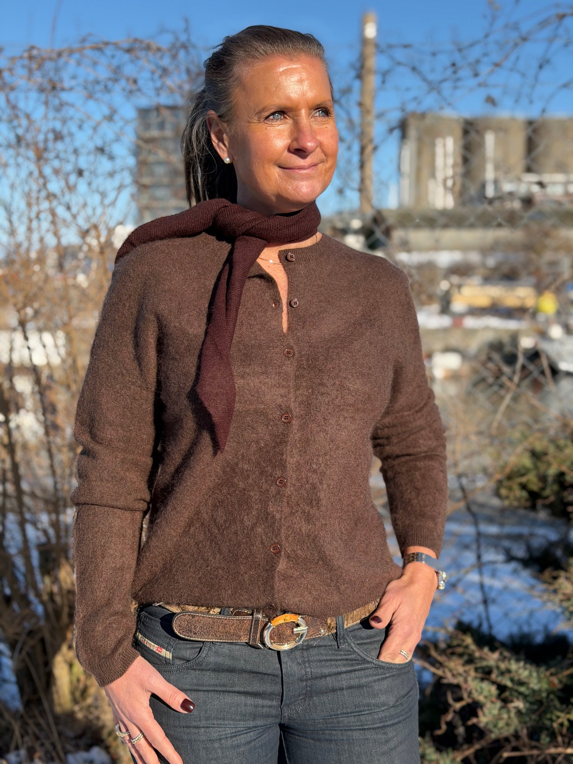 Den här borstade koftan med små knappar och rund hals är en sådan favorit jag alltid vill ha nära till hands. Den är mjuk med den där fluffiga, borstade känslan som gör att den känns varm utan att bli tung. De små knapparna ger ett fint, diskret uttryck och gör det enkelt att styla den på flera sätt, knäppt som en klassisk kofta eller öppen över en topp, skjorta eller klänning. Och vill du ändra uttrycket lite kan du enkelt vika ner kragen så att du får en fin v-ringning. Den mjuka mixen av 20% kashmir och 80% ull ger både den lyxiga känslan och den där sköna värmen du vill bära om och om igen.